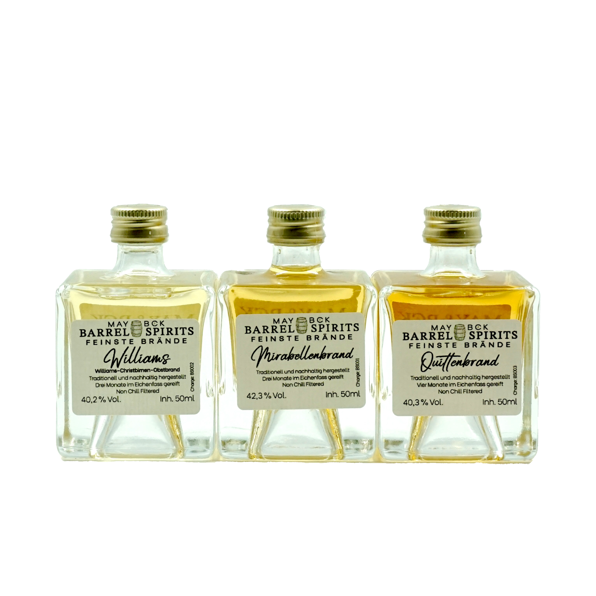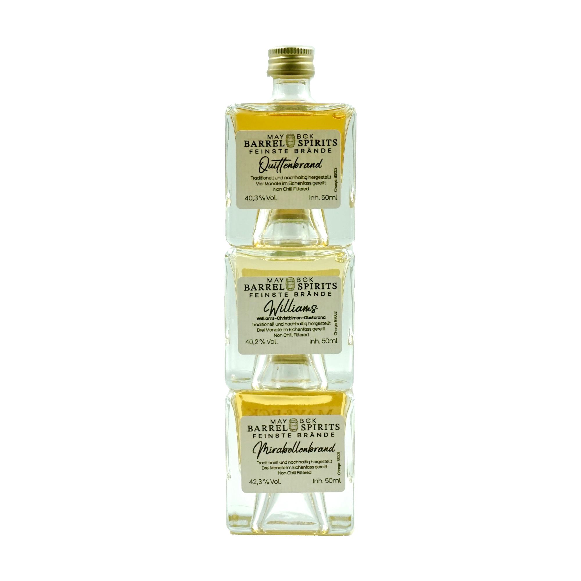 Die "Barrel Spirits"-Produktreihe präsentiert drei außergewöhnliche Obstbrände als 3er-Set. Jedes einzelne Produkt überzeugt durch nachhaltige Produktion, 3 bis 4-monatige Reifung im Eichenfass und den Verzicht auf jegliche Aroma- oder Zusatzstoffe. Auf Trinkstärke verdünnt mit Wasser aus der Region Rureifel.